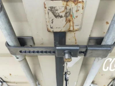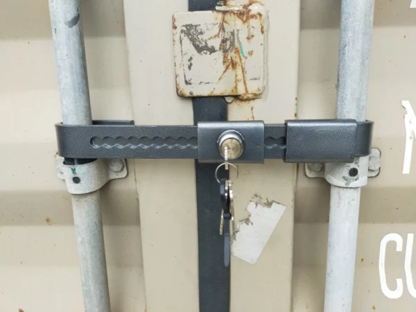 Sistema de chave anti-roubo que se fixa nas cremonas localizadas nas portas dos contentores.